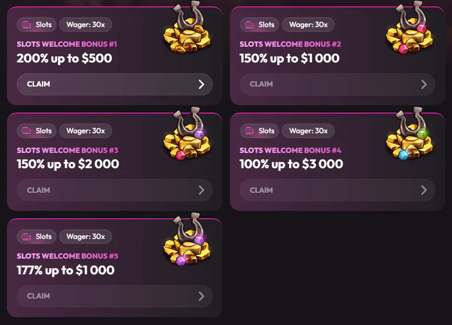 The fifth and final part of the welcome package concludes with an exciting 177% bonus up to £850. It’s an unusual percentage that gives players a bit more than a standard 150% or 100% match, adding a playful twist to the offer structure. Bonus overview: