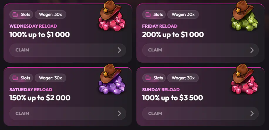 Once you’ve completed the welcome series, MadCasino continues to provide weekly incentives for regular players. These reload offers are available on specific days, allowing you to claim extra funds or spins on top of your real-money deposits. Each reload follows similar conditions:
